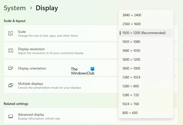 Efter att ha utfört stegen ovan kommer du att se högre skärmupplösningar i Windows 11-inställningar. Öppna Inställningar och gå tillSystem > Display. Klicka påSkärmupplösningrullgardinsmenyn och du kommer att se högre skärmupplösningar.