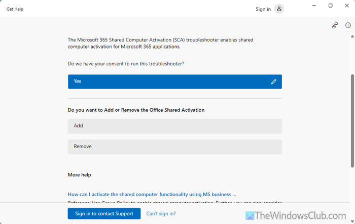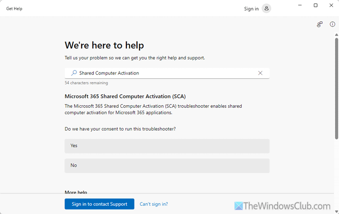 Om du inte kan aktivera Microsoft 365 på en delad dator kan du användaMicrosoft 365 Felsökare för aktivering av delad dator (SCA).för att åtgärda problemet på en Windows 11/10-dator. Den använder Get Help-appen för att fixa problemet med aktivering av delad dator för Microsoft 365-appar.