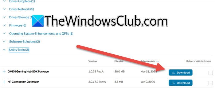 - Scrolla nu ner för att nåVerktyg,expandera den och klicka sedan påLadda nerknapp förknippad med OMEN Gaming Hub SDK-paket.
