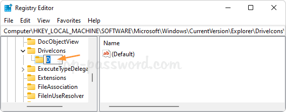 - Cuando se selecciona la clave de letra de unidad, utilice un método similar para crear una subclave denominadaIcono predeterminado. A continuación, haga doble clic en(Por defecto)entrada en el panel derecho.