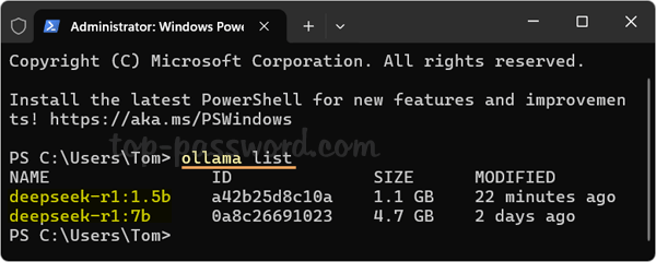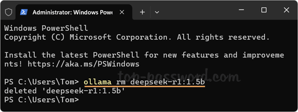 - Esto eliminará el modelo especificado de su sistema. Puede repetir el paso anterior para desinstalar otros modelos de DeepSeek uno por uno.