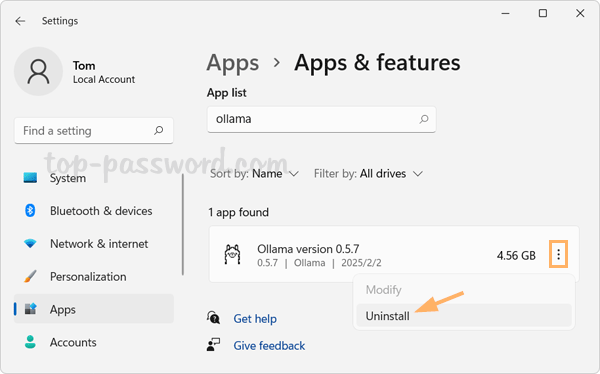 Si no quieres experimentar con Ollama y DeepSeek, simplemente desinstala Ollama de la aplicación Configuración y también te ayudará a eliminar todos los modelos de DeepSeek al mismo tiempo.