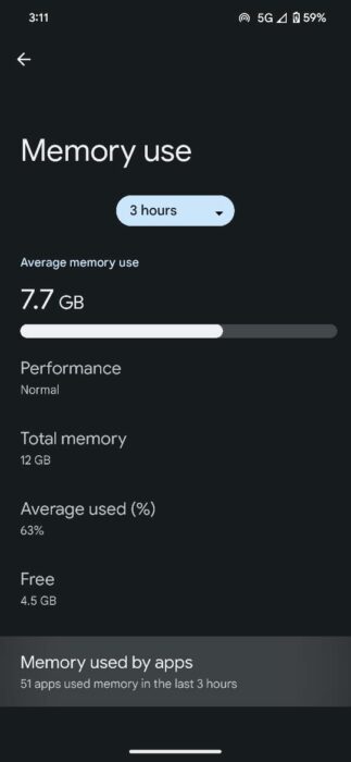Como sugiere el nombre, esta opción permite a los usuarios verificar el uso promedio de memoria en el teléfono mediante varias aplicaciones. Además, los usuarios también pueden personalizar el período de tiempo y revisar el uso promedio por aplicación accediendo a la sección "Memoria utilizada por las aplicaciones".