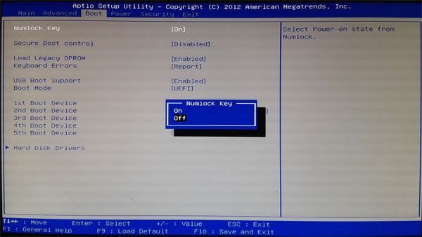 - Ubique el “Estado de bloqueo numérico,” “Tecla Bloq Num“, “Iniciar estado de bloqueo numérico”o una opción similar y cambie el valor aDesactivadooApagado. En mi ejemplo, hay una opción denominada "Tecla Bloq Num" en la pestaña Arranque, selecciónela y presione Entrar para seleccionar Desactivado.