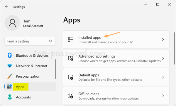 - Presione la tecla Windows + I para iniciar la aplicación Configuración. ElegirAplicacionesen la barra lateral izquierda y luego haga clic en "Aplicaciones instaladas" A la derecha.