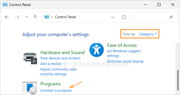 - Abra el Panel de control en elCategoríaver, haga clic en "Desinstalar un programa"enlace bajo elProgramassección.