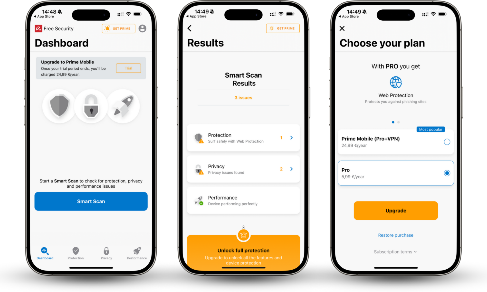 Avira funciona en iOS y iPadOS y también está disponible para macOS, Windows y Android. Muestra un rendimiento óptimo en iOS 13 y superior.