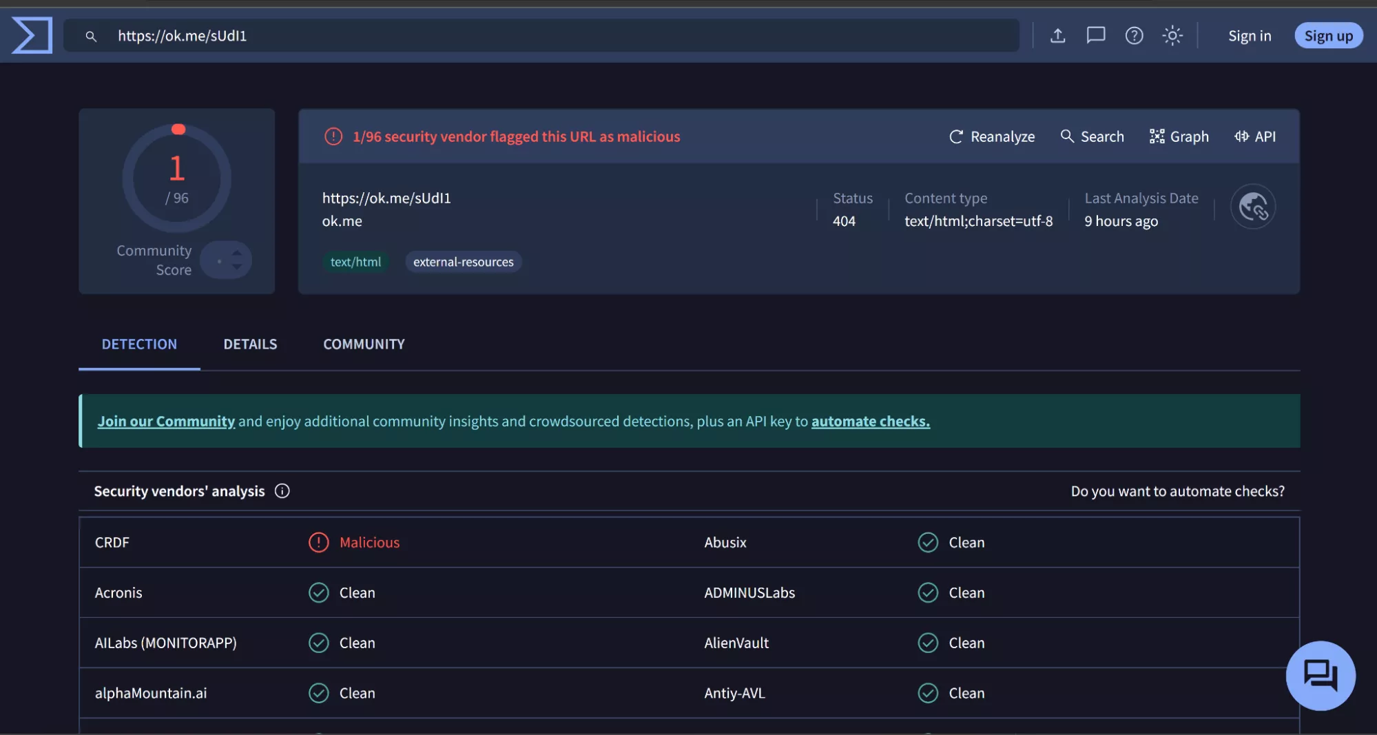 - Verifique enlaces, IP y nombres de dominio:Copie todos los enlaces, nombres de dominio o direcciones IP sospechosos del correo electrónico (sin hacer clic en ellos) y péguelos enVirusTotal. Esta herramienta de código abierto comprueba si varios servicios de seguridad han marcado el enlace como malicioso. Si el enlace no es seguro, elimine el correo electrónico inmediatamente.