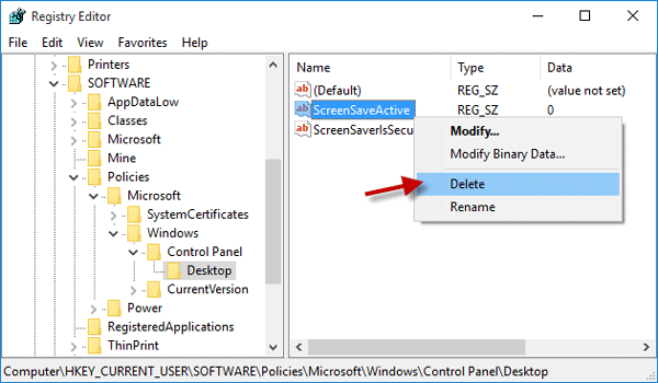 Paso 2: navegue hasta la ubicación: ComputadoraHKEY_CURRENT_USERSOFTWAREPoliciesMicrosoftWindowsControl PanelDesktop. Con la tecla Escritorio seleccionada, verá ScreenSaveActive y ScreenSaveActive en el panel del lado derecho. Elimina ambos.