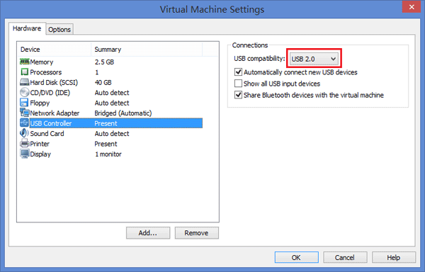 Además, VMware Workstation no admite USB3.0 de forma nativa y necesita controladores adicionales en el invitado para el dispositivo USB. Recomiendo encarecidamente utilizar USB 2.0 para su máquina virtual. Vaya a Configuración de la máquina virtual y asegúrese de que el controlador USB esté presente en la lista de dispositivos y que la compatibilidad USB esté configurada en USB2.0.