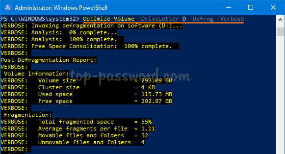 Si decide desfragmentar una unidad, ejecute este comando:Optimize-Volume -DriveLetter D -Defrag -Verbose