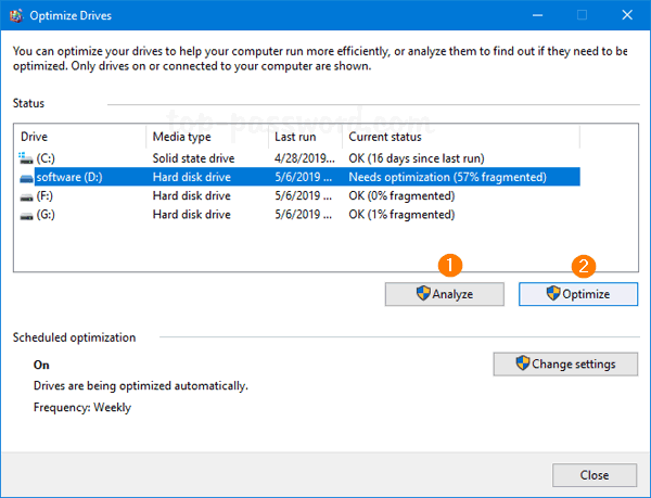 Aparecerá una nueva ventana con detalles sobre sus unidades de disco duro. Puedes hacer clic en elAnalizarpara indicarle qué tan fragmentadas están las unidades y luego haga clic en elOptimizarpara comenzar la desfragmentación.