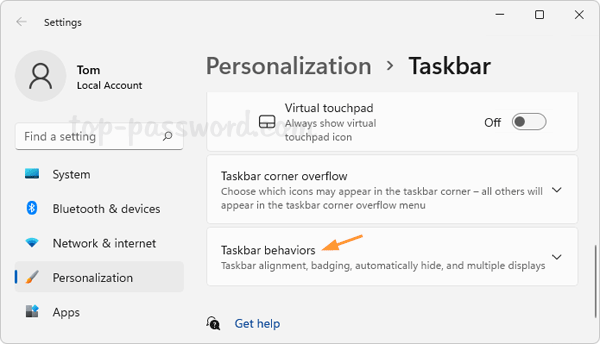 La aplicación Configuración se iniciará en la página relacionada. Hacer clicComportamientos de la barra de tareaspara expandir la configuración.