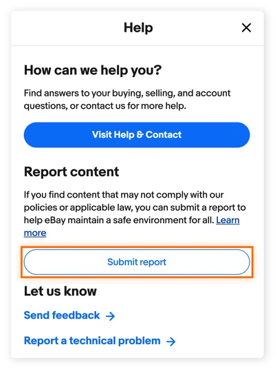 Al denunciar un anuncio o un usuario, ayudas a eBay a identificar y eliminar a los estafadores. Haga esto de inmediato si encuentra signos graves de fraude, como solicitudes de pago fuera de la plataforma, phishing o extorsión de comentarios.