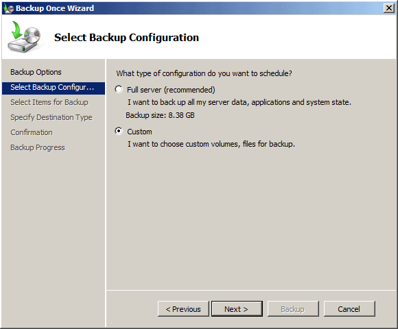 - Si desea realizar una copia de seguridad completa de su servidor, haga clic en elservidor completoopción. Ahora vamos a realizar una copia de seguridad del estado del sistema, así que elegimos elCostumbreopción.