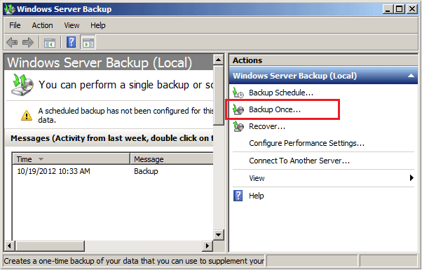 Ahora que tenemos Windows Server Backup instalado, realicemos nuestra primera copia de seguridad de Active Directory en Windows Server 2008.