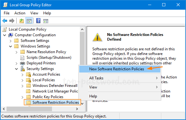 Haga clic derecho enPolíticas de restricción de softwareen el árbol de la consola izquierda y luego seleccioneNuevas políticas de restricción de software.