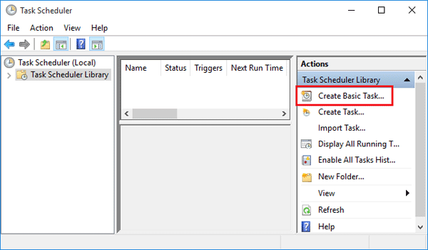 - Para comenzar, abra el Programador de tareas y haga clic en elCrear tareaenlace en el panel derecho Acciones.
