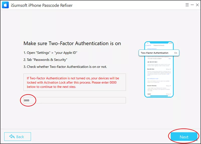 Paso 5: asegúrese de que la autenticación de dos factores esté activada para la ID de Apple en su iPhone. Puedes verificar esto dirigiéndote a Configuración > Nombre de ID de Apple > Contraseña y seguridad > Autenticación de dos factores. Luego, ingrese 0000 en el cuadro de entrada en la página del software y haga clic en Siguiente.