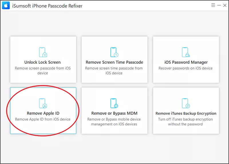 Paso 2: Abra iSoft iPhone Passcode Refixer en su computadora y seleccione la opción Eliminar ID de Apple.
