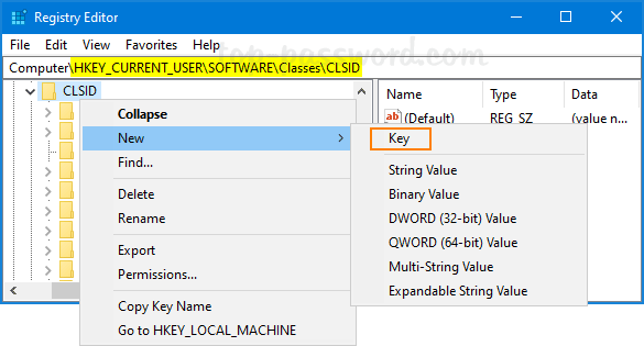 HKEY_CURRENT_USER\SOFTWARE\Classes\CLSID. Haga clic derecho en elCLSIDen el panel izquierdo y luego seleccioneNuevo->Llave.