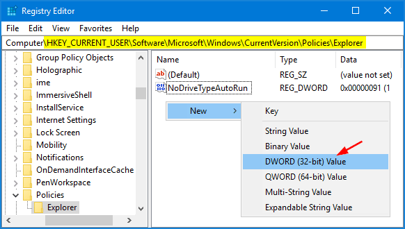 HKEY_LOCAL_MACHINE\SOFTWARE\Microsoft\Windows\CurrentVersion\Explorer - En el panel del lado izquierdo, haga clic derecho en elExploradory luego seleccioneNuevo->Valor DWORD (32 bits).