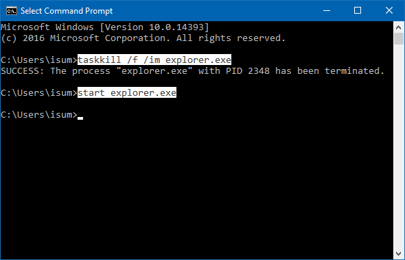 Paso 3: Luego escribeiniciar explorer.execomando para iniciar el proceso explorer.exe.
