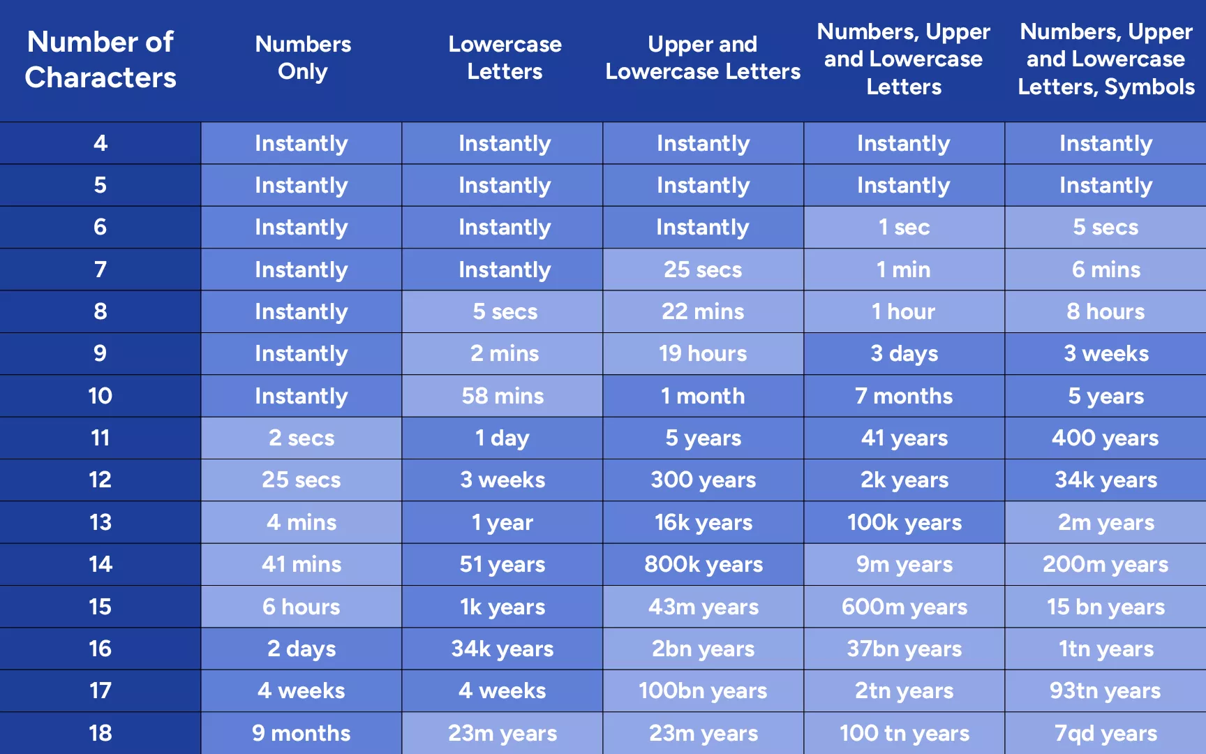 Además de eso, tus contraseñas no deberían ser muy simples.La resistencia de una contraseña a ser descifrada aumenta con su longitud y la inclusión de diversos elementos como variaciones de letras, símbolos y números.Eche un vistazo a la imagen a continuación para ver cuánto tiempo le toma a un hacker descifrar su contraseña con “fuerza bruta” (simplemente tratando de encontrar los símbolos correctos). Es por eso que el uso de un administrador de contraseñas y un software de generación de contraseñas (bitwarden,1contraseña,yDashlanesería suficiente) es esencial para hacer que su criptografía sea lo más segura posible.