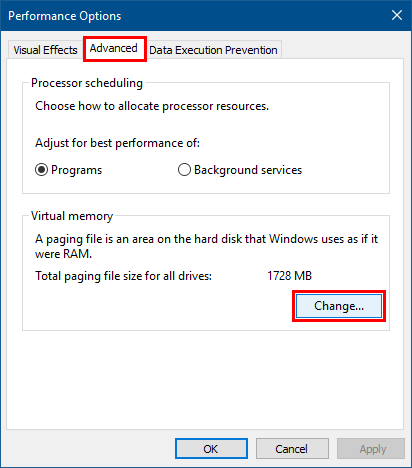 Paso 3: haga clic enAvanzadoy luego haga clic en elCambiaren la sección Memoria virtual.