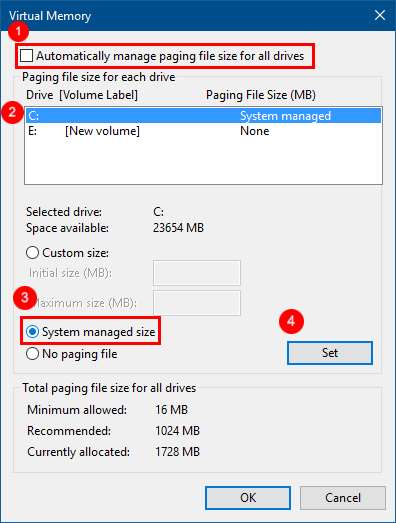 Seleccione una unidad(DO:)que desea que se administre su sistema de tamaño de archivos de paginación. SeleccionarTamaño administrado por el sistemaopción, haga clicColocarbotón. Cuando termine, haga clic enDE ACUERDO.