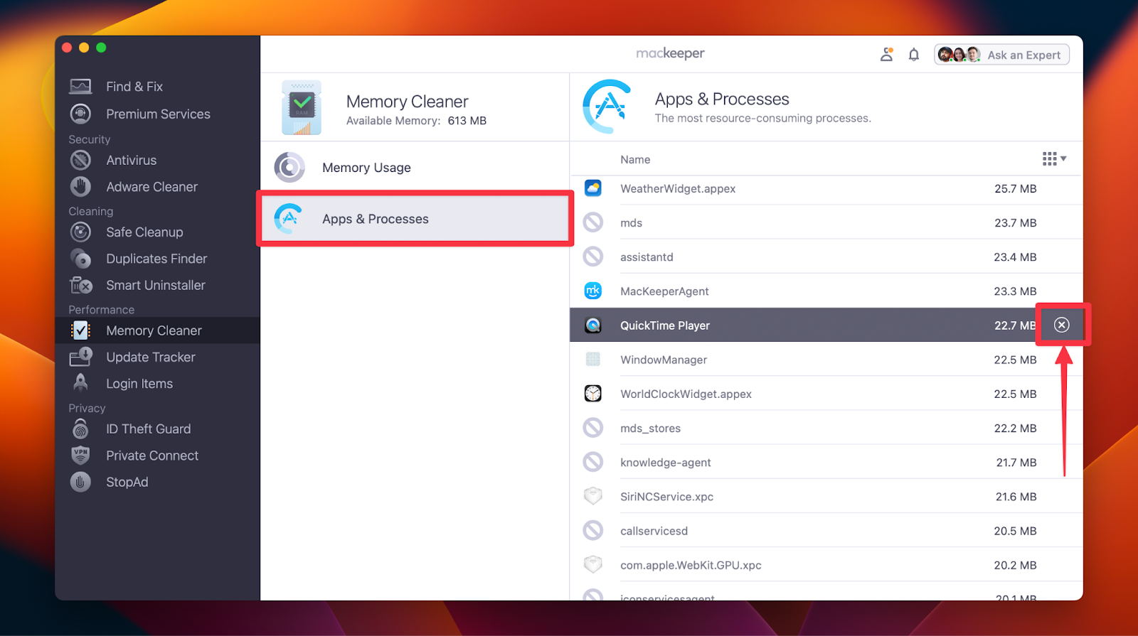 Aunque es un poco poco convencional, puedes usar Memory Cleaner de MacKeeper para detener la grabación de pantalla QuickTime en Mac. Funciona de forma similar al Monitor de actividad. Así es como puedes usar MacKeeper para detener la grabación de pantalla en QuickTime Player: