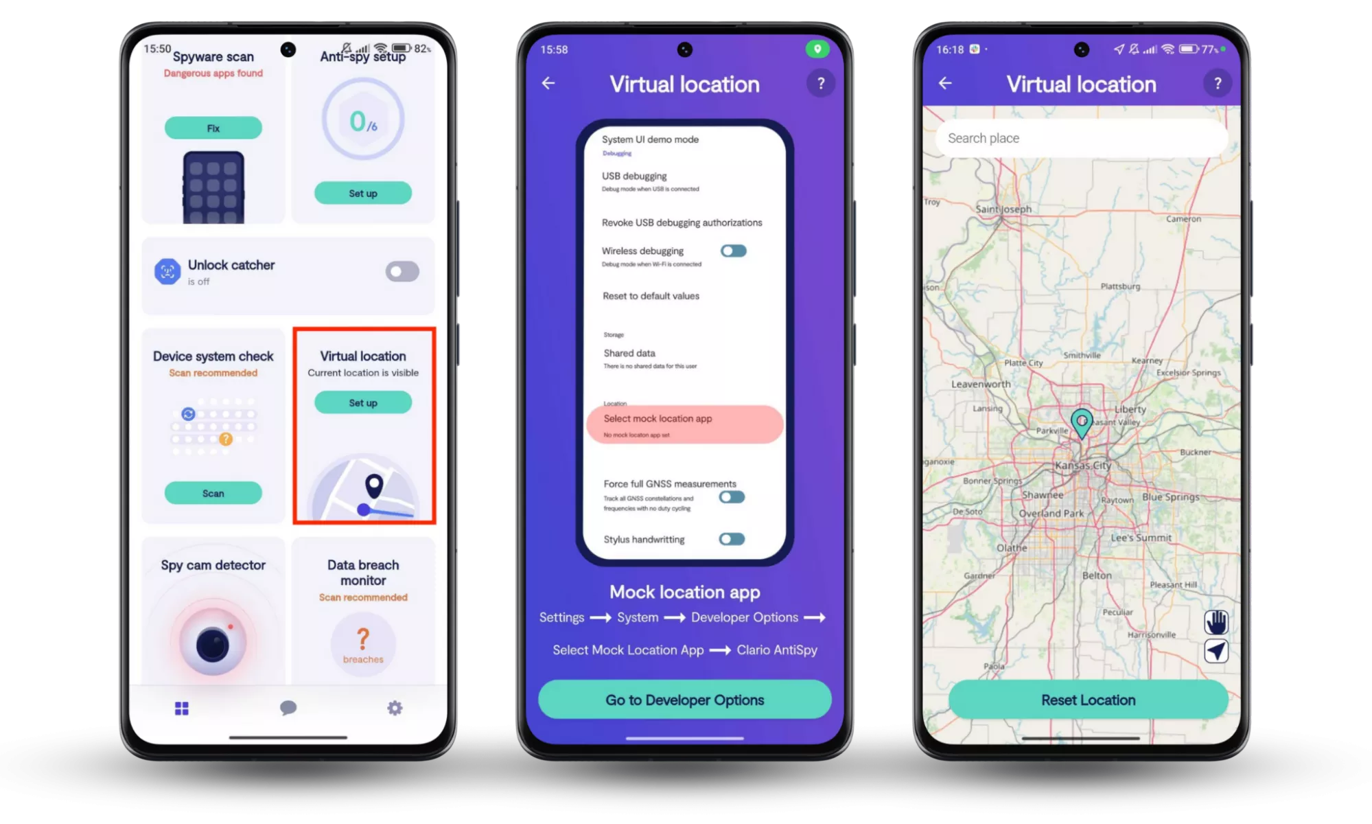 A continuación se explica cómo utilizar la ubicación virtual de Clario Anti Spy: