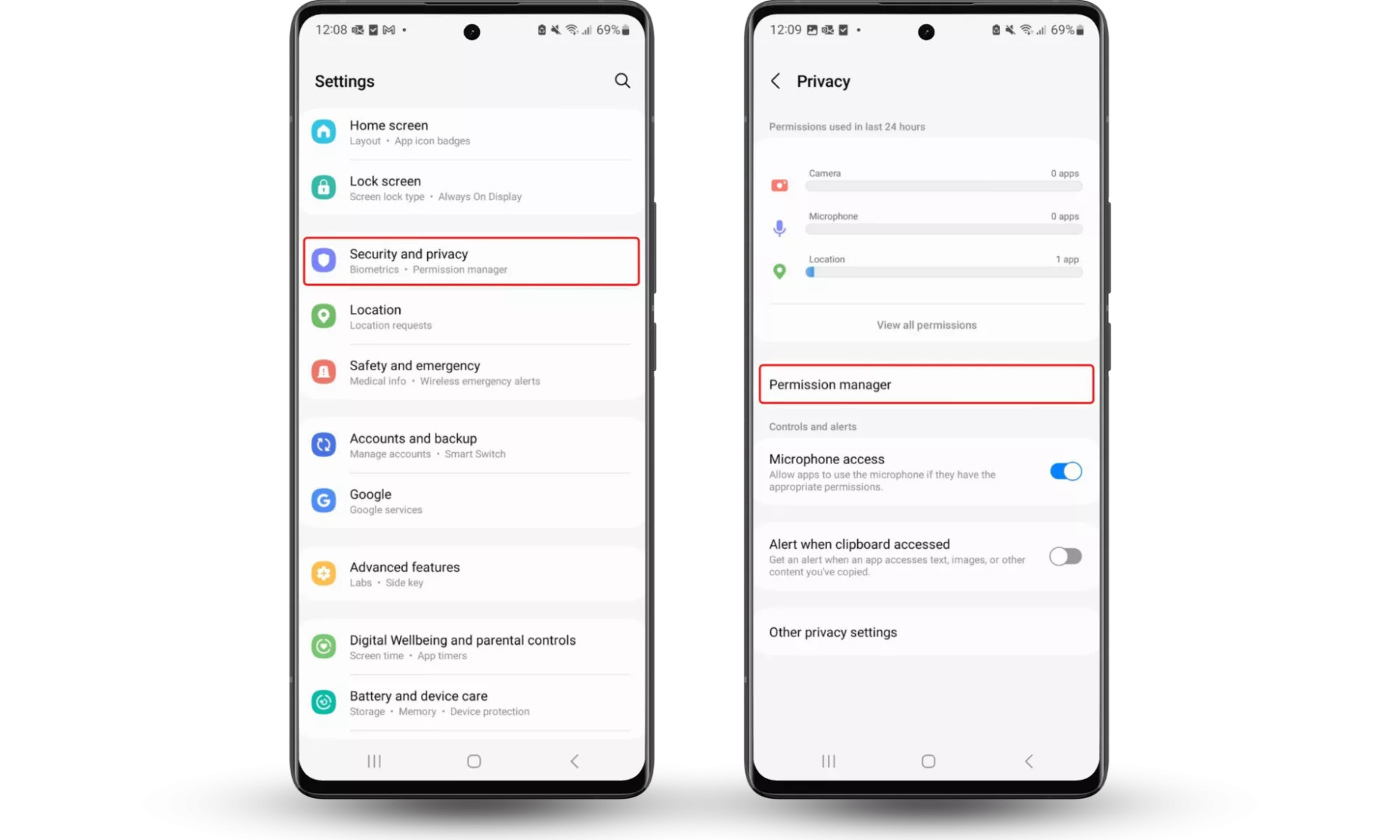 Pasos 1 a 3: Configuración > Seguridad y privacidad > Privacidad > Administrador de permisos > seleccione una función > No permitirAlternativamente, usar una buena aplicación de seguridad para eliminar cualquier software espía de su dispositivo detendrá rápidamente cualquier seguimiento no autorizado.
