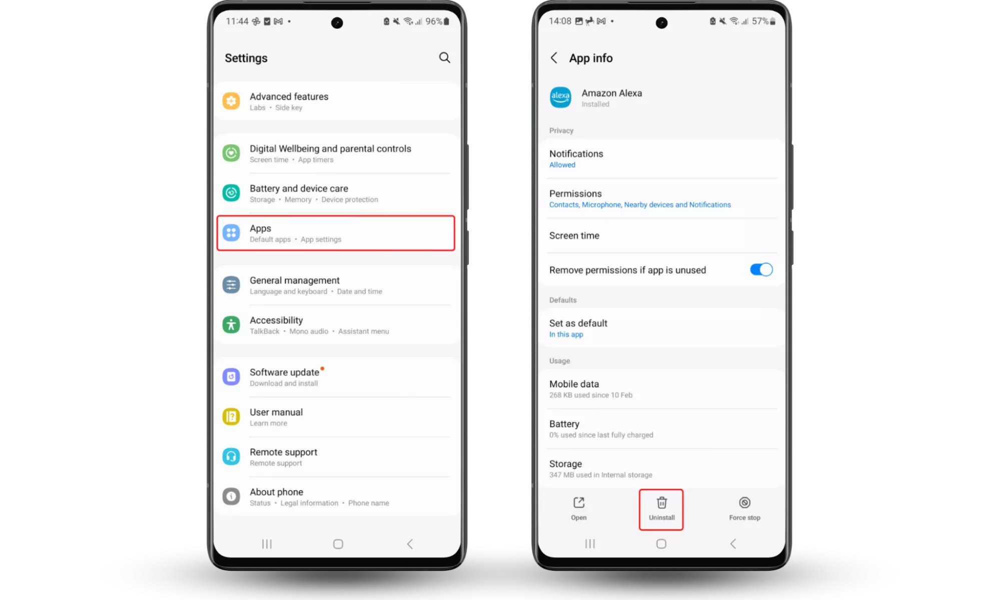 Pasos 1-2: Configuración > Aplicaciones > seleccione la aplicación > Desinstalar o Desactivar