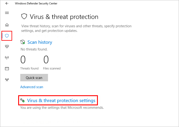 Paso 2: Haga clic enProtección contra amenazas de virusmosaico en la barra de menú izquierda. Hacer clicConfiguración de protección contra virus y amenazas.