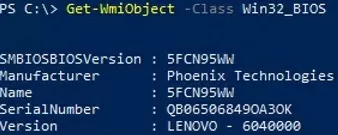 De forma predeterminada, el comando devuelve información sobre la versión del BIOS (SMBIOSBIOSVersion), el fabricante, el número de serie y el modelo de computadora.