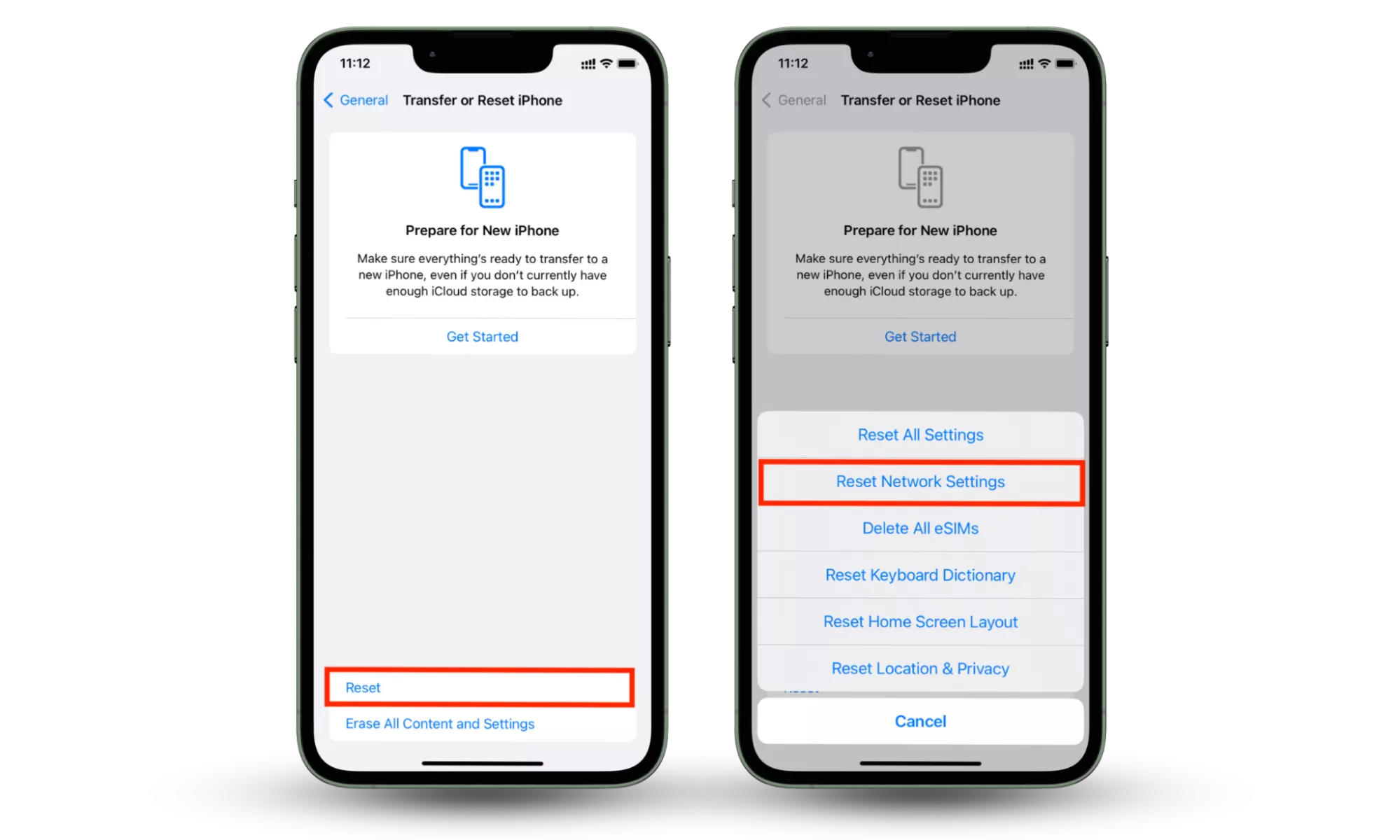- GrifoTransferir o restablecer iPhone>Reiniciar>Restablecer la configuración de red.