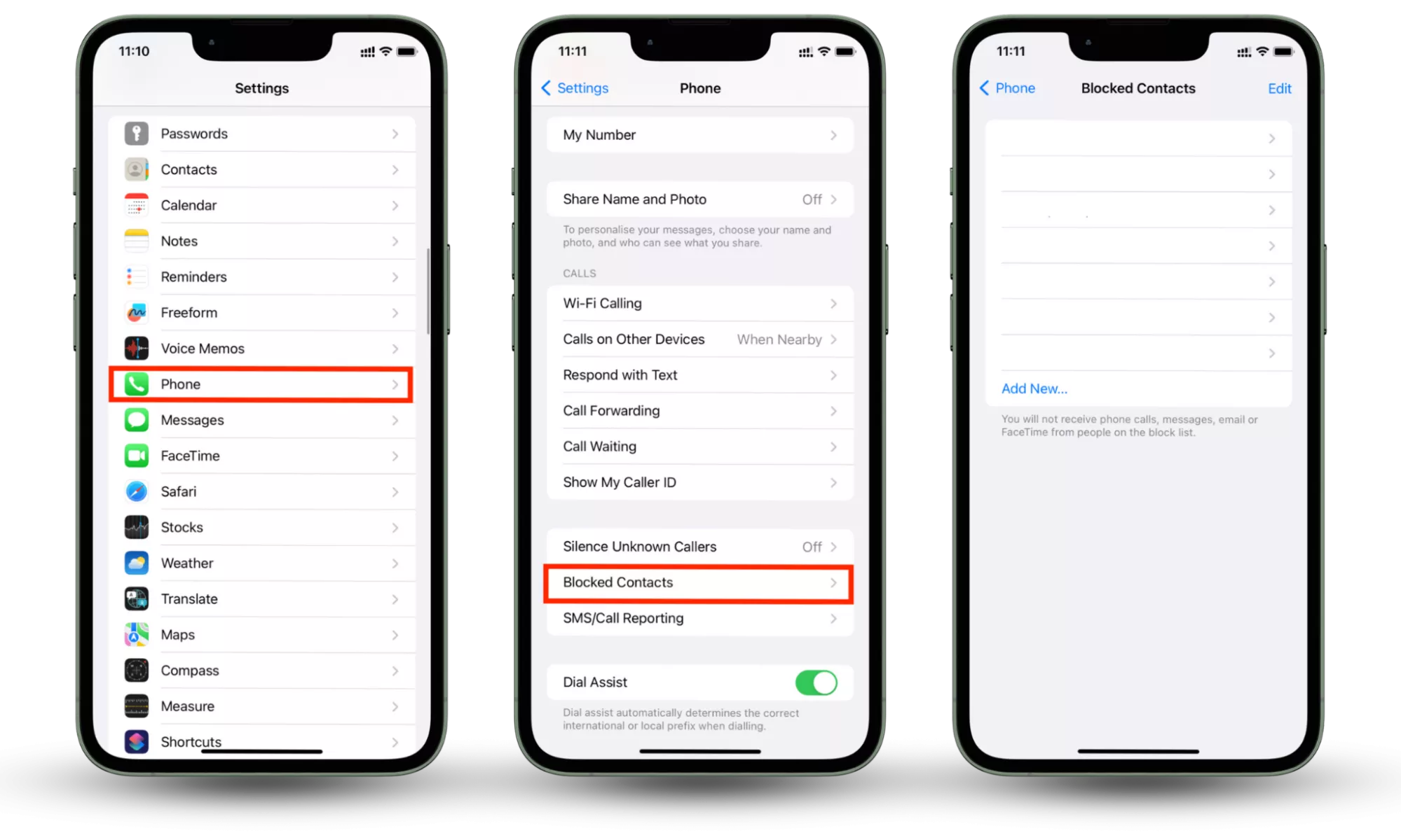 Paso 1-2: Configuración > Teléfono > Contactos bloqueados. Toque Editar para agregar o eliminar.10. Desactivar el desvío de llamadas