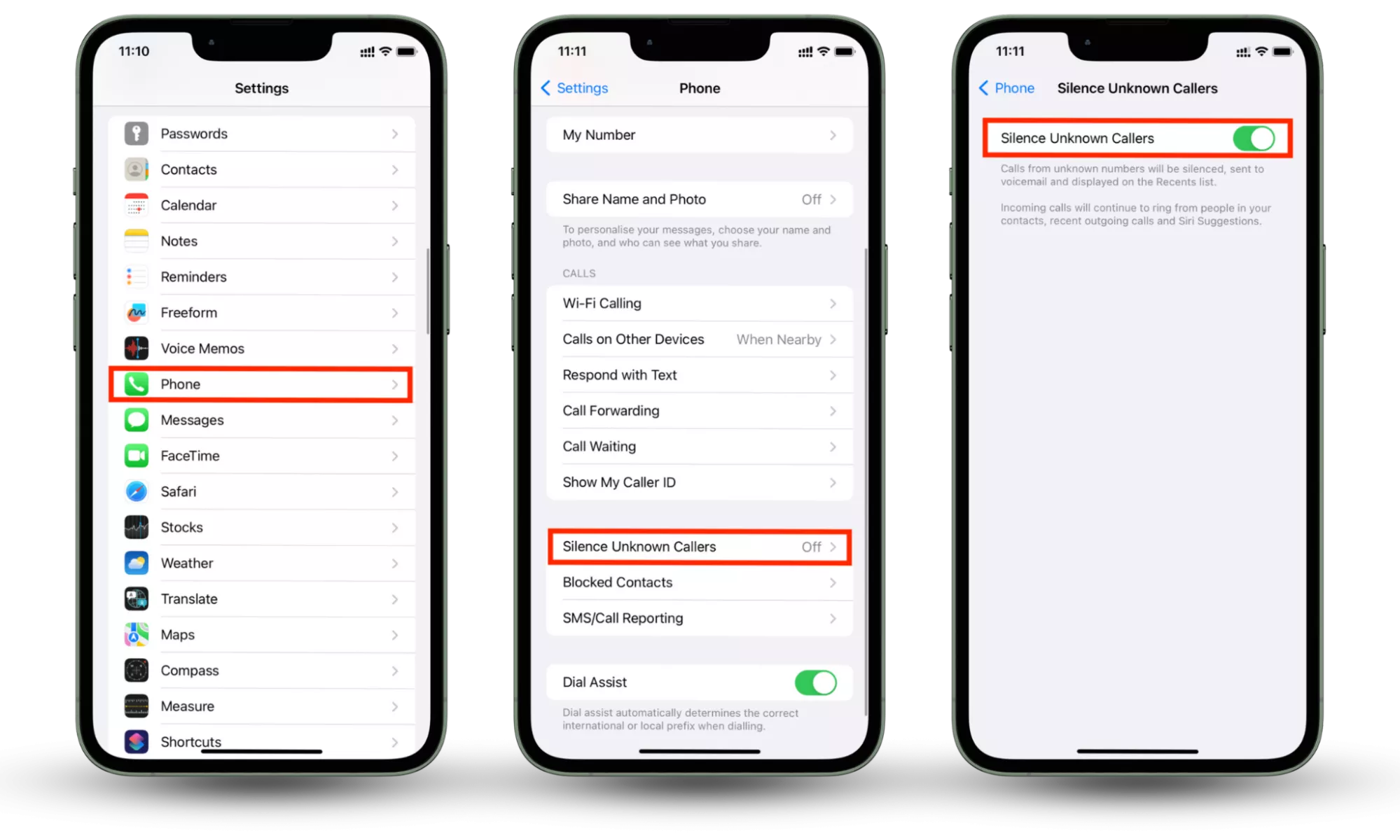 Pasos 1-2: Configuración > Teléfono > Desvío de llamadas > desactiva el Desvío de llamadas.11. Desactivar el silencio de personas desconocidas.