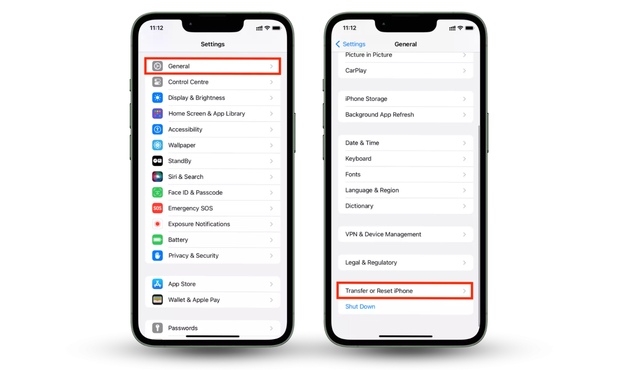 Pasos 1-2: Configuración > General > Transferir o restablecer iPhone.