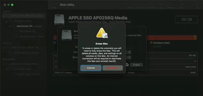 Elija su disco duro principal (generalmente “Macintosh HD”), haga clic en Borrar, seleccione el formato APFS y haga clic en Borrar.
