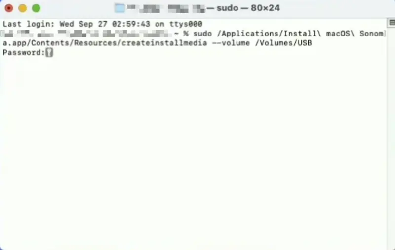 sudo /Applications/Install macOS Ventura.app/Contents/Resources/createinstallmedia --volume /Volumes/MyVolumeIngrese su contraseña de administrador cuando se le solicite y espere a que se cree la unidad de arranque.