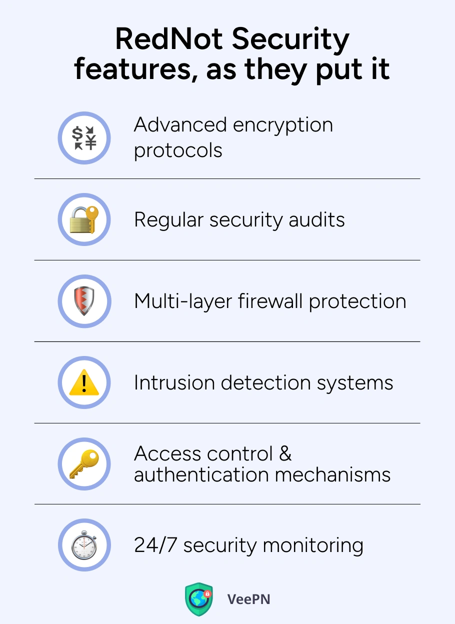 ElSitio web de RedNoteinforma a los usuarios sobre medidas típicas como "almacenamiento seguro", "estándares para mantener segura su información personal", "moderación algorítmica" y "gestión de la seguridad de los datos". Pero no hay ninguna especificación sobre cómo se hacen cumplir estas cosas.