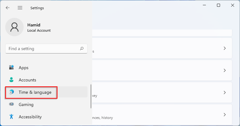 Paso 1:ElegirHora e idiomadesde las opciones de Configuración.