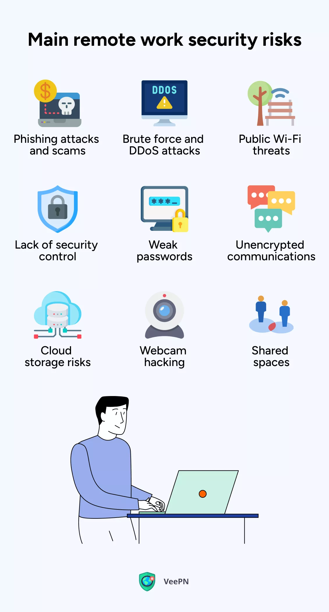Los trabajadores remotos pueden enfrentar múltiples problemas de seguridad en línea, ya que tienden a utilizar dispositivos personales y redes inseguras al acceder y transmitir información confidencial. Los riesgos más comunes incluyen:
