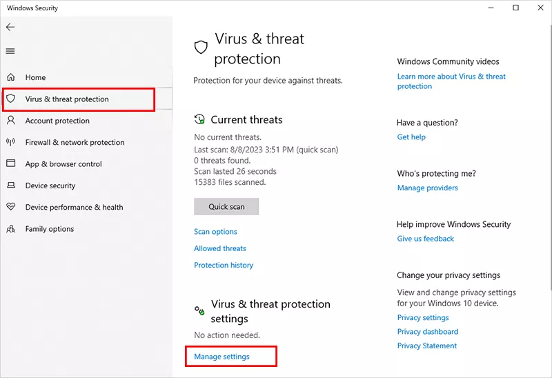 Paso 2: Haga clicProtección contra virus y amenazasen el menú de la izquierda. Entonces sigue adelanteAdministrar configuracionesen Configuración de protección contra virus y amenazas en el panel derecho.