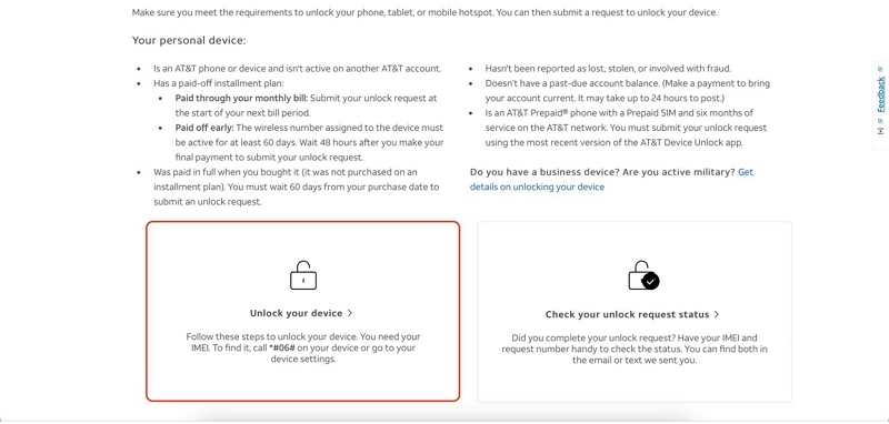 Ahora, echemos un vistazo a los pasos que debes seguir para desbloquear tu dispositivo a través del sitio web oficial de AT&T: