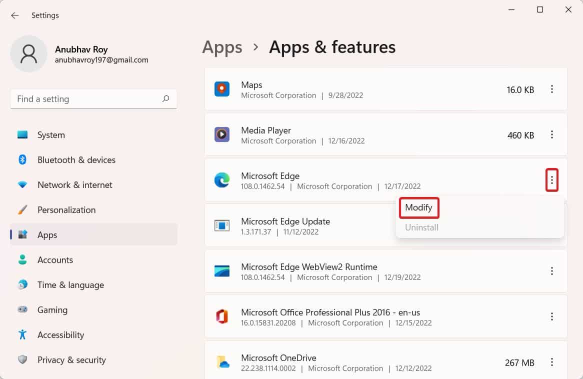 - En la lista de aplicaciones instaladas, busqueBorde de Microsoft.