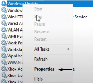 - Haga clic derecho en“Actualización de Windows”usando el mouse, luego seleccione “Propiedades”.