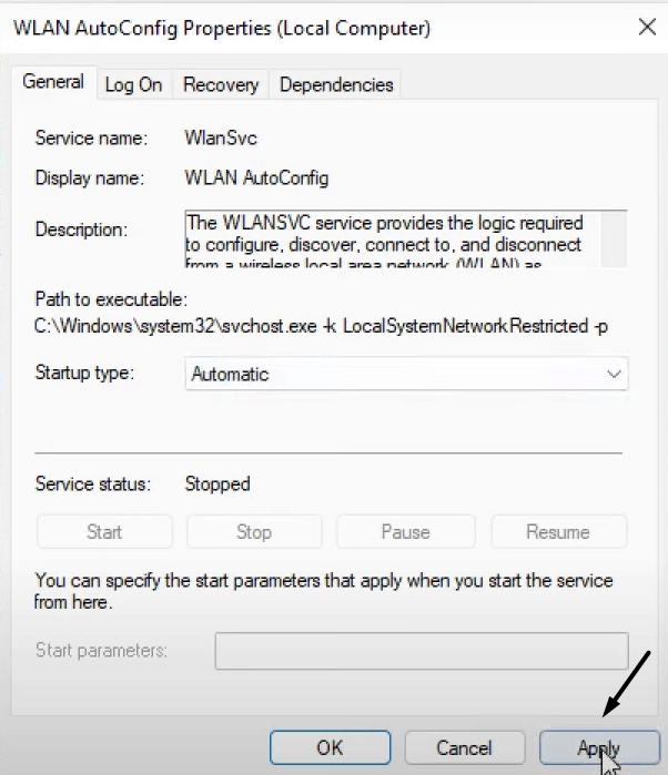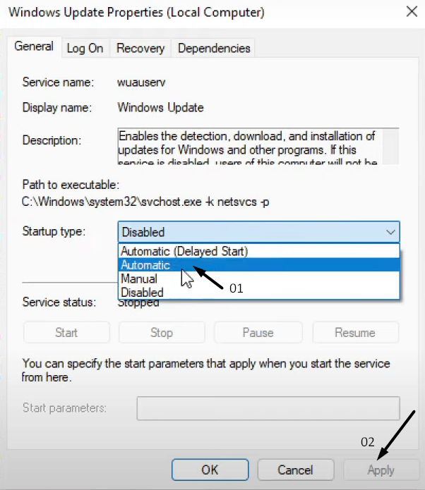 - Cambie el tipo de inicio de deshabilitado a "Automático" luego haga clic en "Aplicar”.
